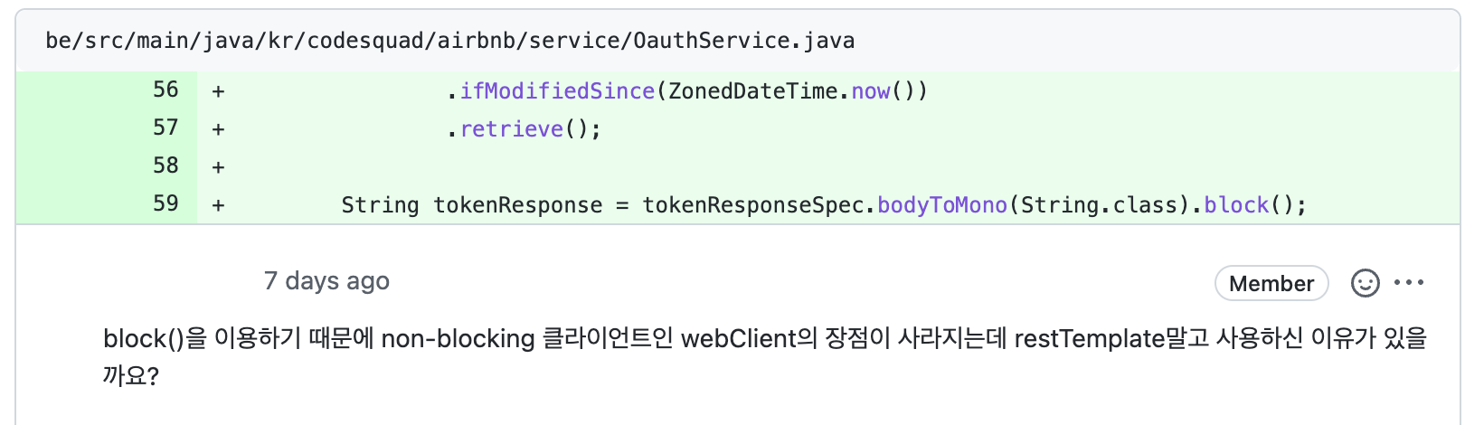 3) 과정에서 어떤 일이 일어나는 건지 전혀 이해하지 못하고, "일단 로그인을 구현해보자!"하는 일념으로 구글 주도 개발을 한 모습. Body를 mono로 바꾼다는 게 뭐지? 그리고 block()을 하면 최종적으로 String으로 변환된다는데... block()이 하는 역할은 뭐지? 생각하면서 우선 코드를 짰더니, 아니나 다를까 리뷰어가 바로 이런 댓글을 달아 주셨다.