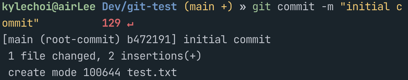 자, 처음에 있는 [main b472191]은 브랜치명과 커밋 해시값이라는 것은 쉽게 알 수 있다. 그 다음 줄에 있는 1 file changed, 2 insertions(+)는 이전 커밋에 비해 몇 개 파일이 변경됐는지, 추가된 라인 수와 줄어든 라인 수가 나온다.