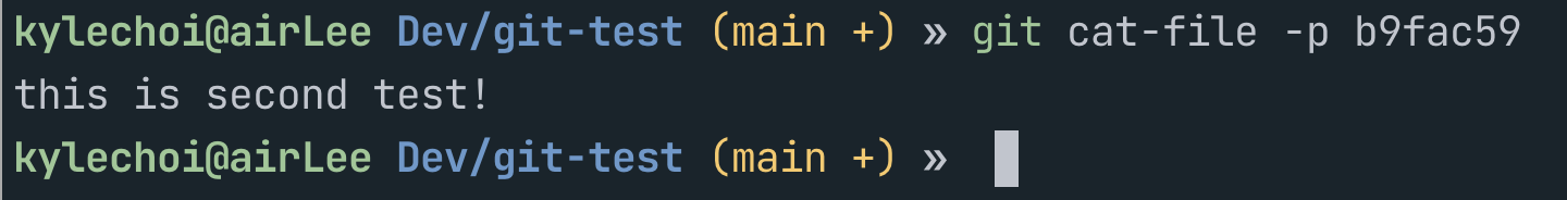 자, 여기에 더해서 test2.txt라는 파일을 새로 만들었다고 생각해 보자. 이 파일에는 “this is second test!”라는 내용을 적어 넣겠다. 그리고 git add로 이 파일을 stage에 올리면 objects 디렉토리의 내용은 다음과 같이 된다. b9/fac595 파일이 생성된 걸 볼 수 있다. 이제 우린 이게 blob 파일임을 안다. 이 파일의 내용은 test2.txt의 내용을 담고 있다.