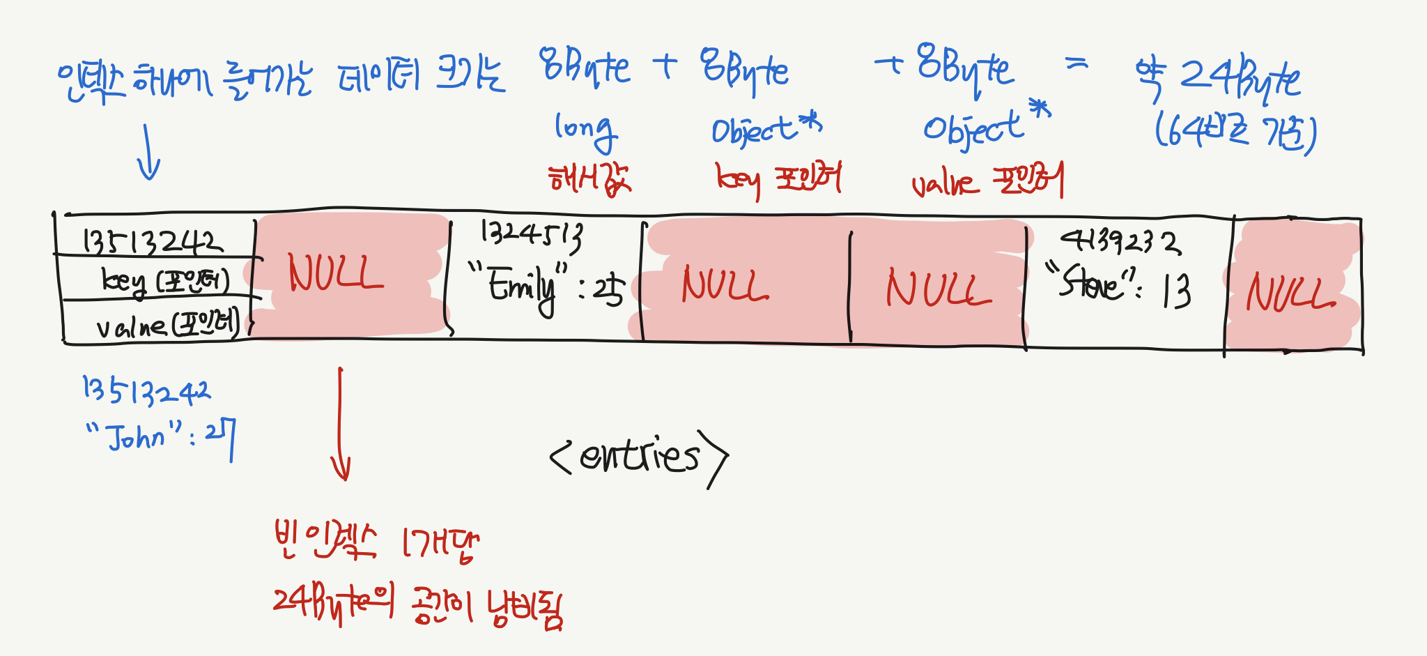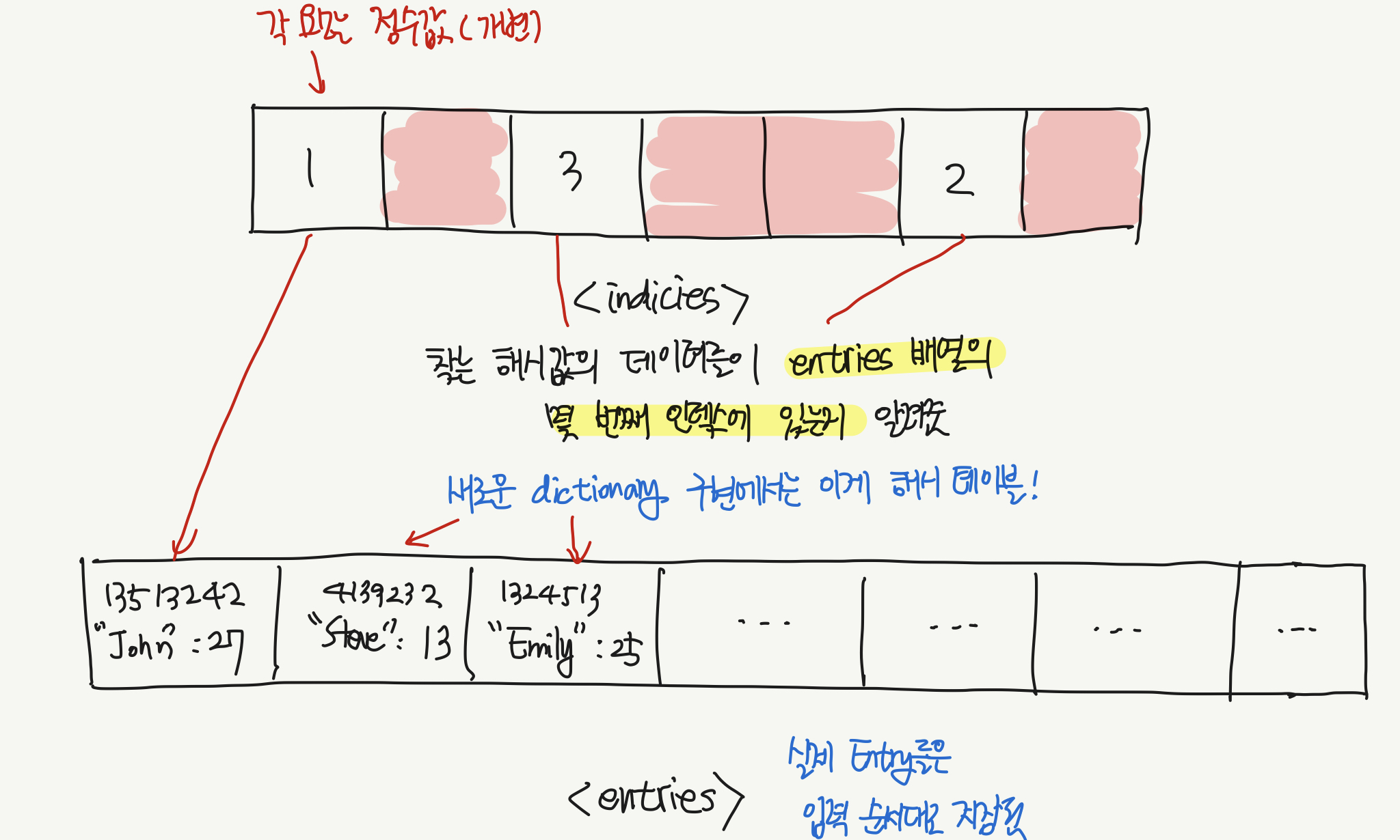 원래의 딕셔너리 구조는 위에서 살펴본 자바의 HashMap이 그렇듯 배열 안에 실제 key, value가 들어있는 구조였다. 이 key, value가 들어있는 배열을 entries라고 보면, entries[해싱된 인덱스]에 key, value가 들어있을 것이고, 해시 테이블 특성상 entries 배열에는 비어있는 인덱스가 많은 구조일 수밖에 없다.